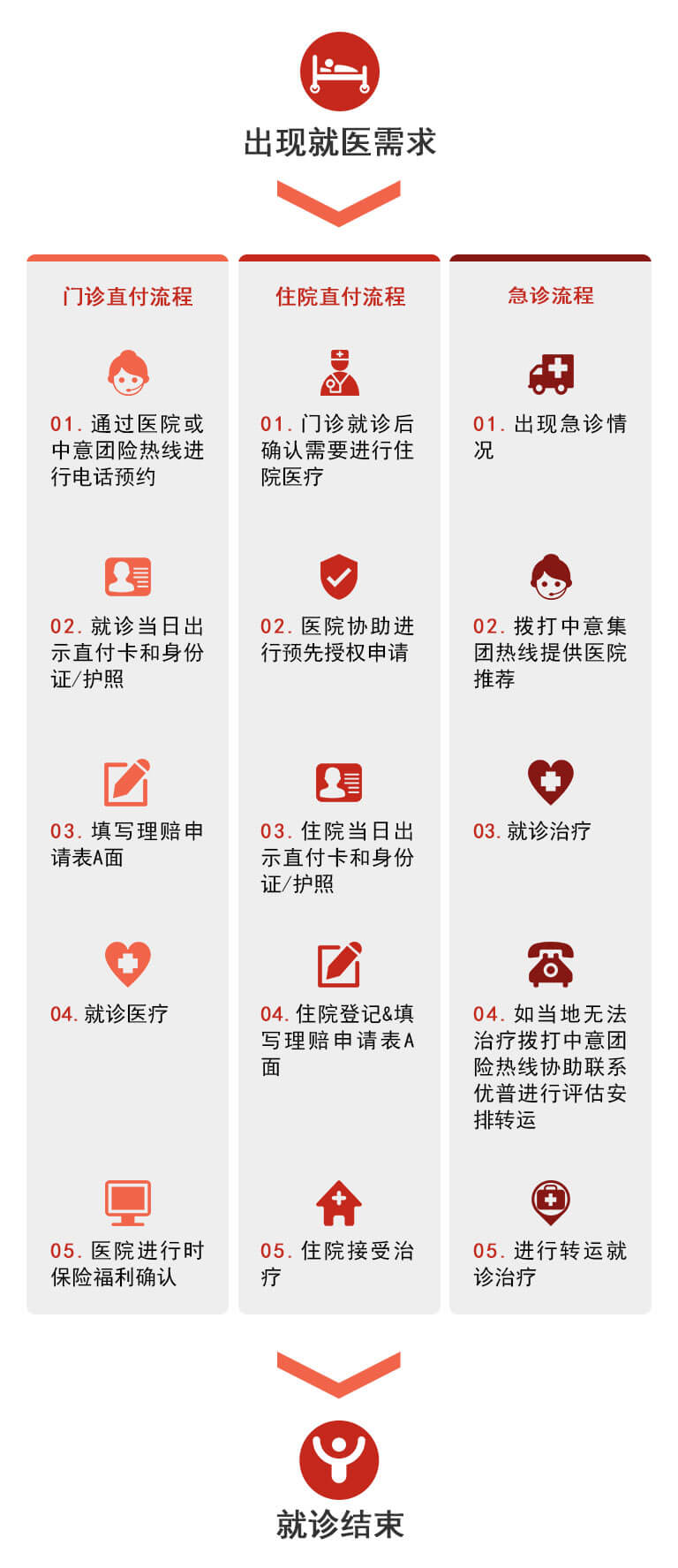 高端醫(yī)療產(chǎn)品依托歐美等發(fā)達(dá)國(guó)家醫(yī)療體系,就診流程與國(guó)內(nèi)有較大區(qū)別,如就診預(yù)約制,住院需要申請(qǐng)預(yù)授權(quán),轉(zhuǎn)診責(zé)任制等。中意人壽以客戶(hù)便利為優(yōu)先,制定如下建議流程圖供您參考。