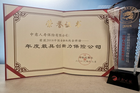 中意人壽在金融時報社與中國社會科學(xué)院金融研究所主辦的“中國金融機構(gòu)金牌榜●金龍獎”活動中獲得“2018年度最具創(chuàng)新力保險公司”的殊榮。